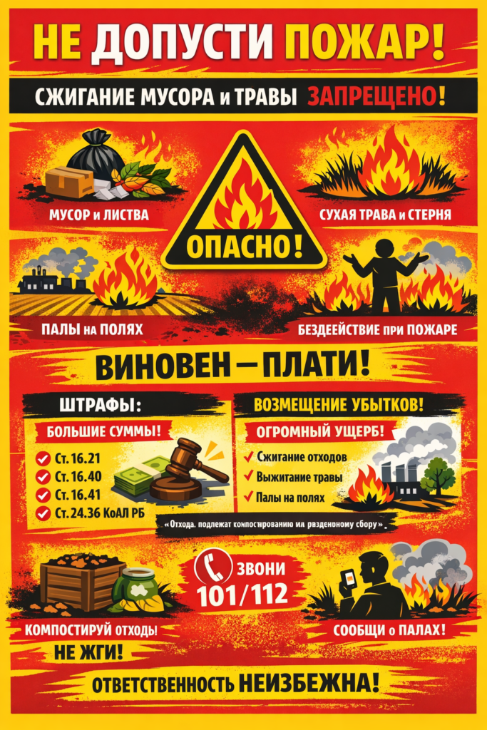Министерство природных ресурсов и охраны окружающей среды призывает жителей страны не допускать выжигания сухой растительности и соблюдать требования безопасности при сжигании мусора!